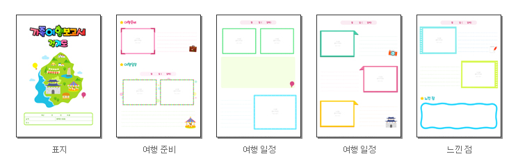 표지, 여행준비, 여행일정, 느낀점을 작성 할 수 있도록 구성되어 있으며, 프린트(A4)되는 장수는 총 5장입니다.
