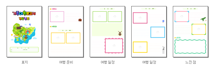 표지, 여행준비, 여행일정, 느낀점을 작성 할 수 있도록 구성되어 있으며, 프린트(A4)되는 장수는 총 5장입니다.
