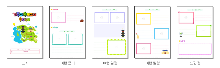 표지, 여행준비, 여행일정, 느낀점을 작성 할 수 있도록 구성되어 있으며, 프린트(A4)되는 장수는 총 5장입니다.