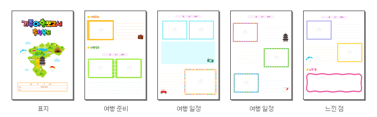 표지, 여행준비, 여행일정, 느낀점을 작성 할 수 있도록 구성되어 있으며, 프린트(A4)되는 장수는 총 5장입니다.
