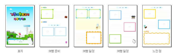표지, 여행준비, 여행일정, 느낀점을 작성 할 수 있도록 구성되어 있으며, 프린트(A4)되는 장수는 총 5장입니다.