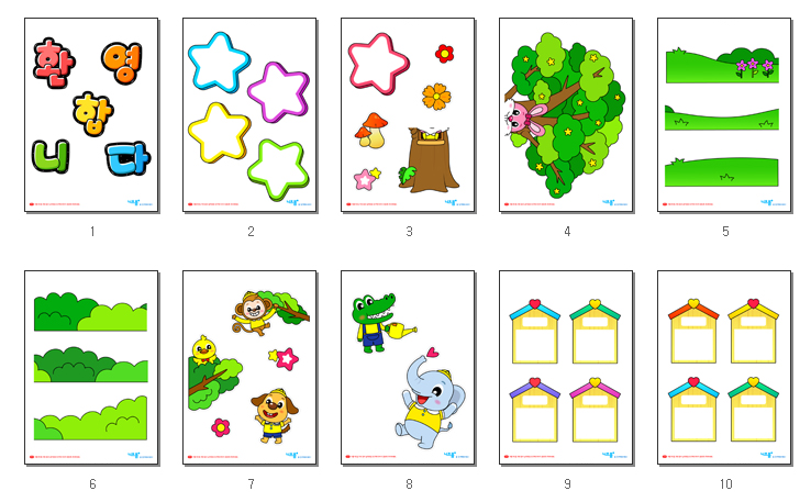 귀여운동물, 숲속배경, 타이틀POP로 구성되었으며, 프린트(A4)되는 장수는 총 10장입니다.