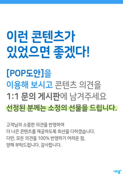 [POP도안]을 이용해 보시고 콘텐츠에 대한 의견을 1:1 문의 게시판에 남겨주세요.