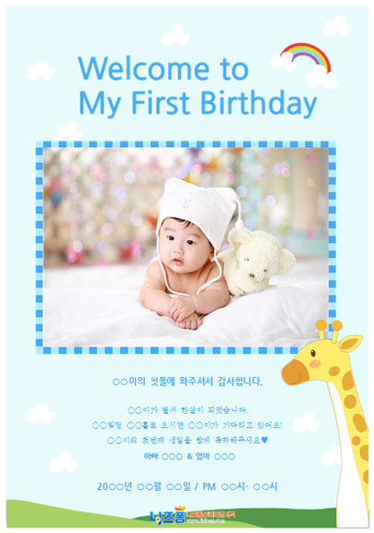 본 서식은 니즈폼(www.nizform.com)을 통해 서비스되는 돌잔치안내문(기린과구름)(으)로서, 다운로드 받으신 후, 내용을 수정하거나 입력하여 사용하시면 됩니다.