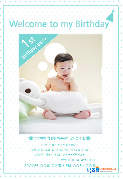 본 서식은 니즈폼(www.nizform.com)을 통해 서비스되는 돌잔치안내문(꼬깔모자)(으)로서, 다운로드 받으신 후, 내용을 수정하거나 입력하여 사용하시면 됩니다.