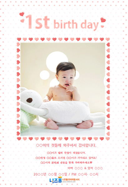 본 서식은 니즈폼(www.nizform.com)을 통해 서비스되는 돌잔치안내문(하트와도트무늬)(으)로서, 다운로드 받으신 후, 내용을 수정하거나 입력하여 사용하시면 됩니다.