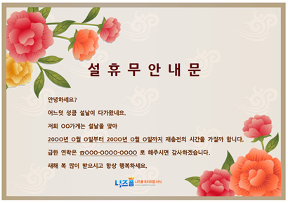 본 서식은 니즈폼(www.nizform.com)을 통해 서비스되는 설날휴무안내문(장미꽃)(으)로서, 다운로드 받으신 후, 내용을 수정하거나 입력하여 사용하시면 됩니다.