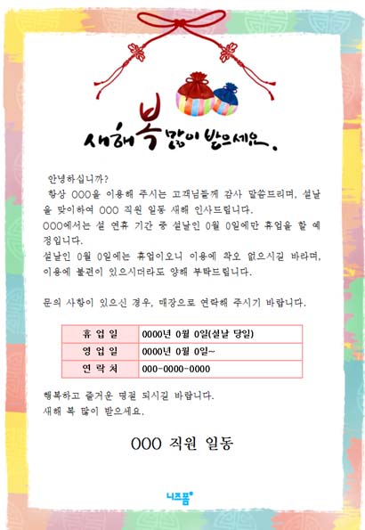 본 콘텐츠는 니즈폼(www.nizform.com)을 통해 서비스되는 설날안내문_설날휴무안내문(전통문양)(으)로서, 다운로드 받으신 후, 내용을 수정하거나 입력하여 사용하시면 됩니다.