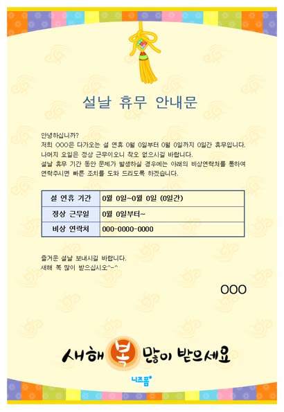 본 콘텐츠는 니즈폼(www.nizform.com)을 통해 서비스되는 설날안내문_설날휴무안내문(색동무늬)(으)로서, 다운로드 받으신 후, 내용을 수정하거나 입력하여 사용하시면 됩니다.