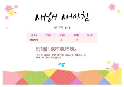 본 콘텐츠는 니즈폼(www.nizform.com)을 통해 서비스되는 설날안내문_설날휴무안내문(매화꽃)(으)로서, 다운로드 받으신 후, 내용을 수정하거나 입력하여 사용하시면 됩니다.