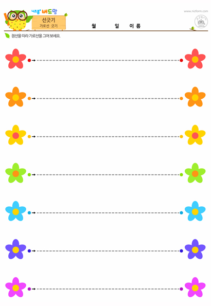 선긋기는 처음 한글이나 숫자를 쓰기 시작하는 아이에게 운필력과 정확도를 길러주는데 좋습니다.