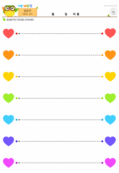 선긋기는 처음 한글이나 숫자를 쓰기 시작하는 아이에게 운필력과 정확도를 길러주는데 좋습니다.