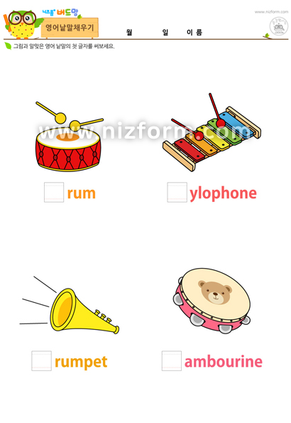 본 서식은 니즈폼(www.nizform.com)을 통해 서비스되는 영어낱말채우기(학용품/악기)입니다.