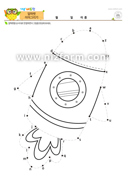본 콘텐츠는 니즈폼(www.nizform.com)을 통해 서비스되는 알파벳이어그리기_알파벳잇기(우주선)(으)로서, 프린트한 후 알파벳을 순서대로 연결하면 우주선이 완성됩니다.
