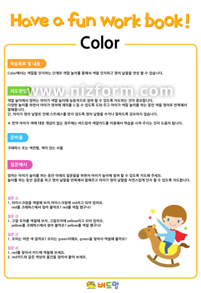 본 콘텐츠는 니즈폼(www.nizform.com)을 통해 서비스되는 영어창의놀이_색깔놀이(학습방법)(으)로서, 프린트하여 사용하시면 됩니다.