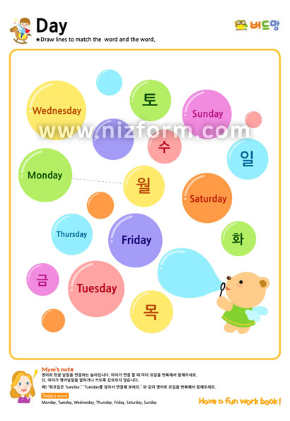 본 콘텐츠는 니즈폼(www.nizform.com)을 통해 서비스되는 영어창의놀이_요일놀이(낱말연결하기)(으)로서, 프린트하여 사용하시면 됩니다.