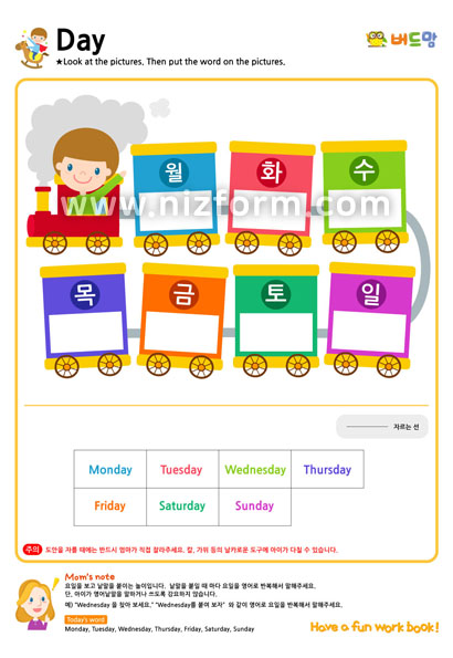 본 콘텐츠는 니즈폼(www.nizform.com)을 통해 서비스되는 영어창의놀이_요일놀이(스티커북)(으)로서, 프린트하여 사용하시면 됩니다.