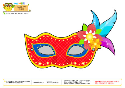 출력하신 후, 테두리를 따라 가면을 자른 뒤, 눈부분 구멍과 끈을 연결할 구멍을 뚫어서 사용하시면 됩니다.