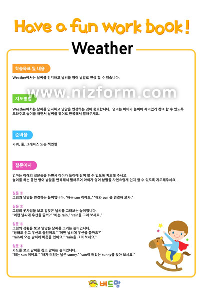 본 콘텐츠는 니즈폼(www.nizform.com)을 통해 서비스되는 영어창의놀이_날씨놀이(학습방법)(으)로서, 프린트하여 사용하시면 됩니다.