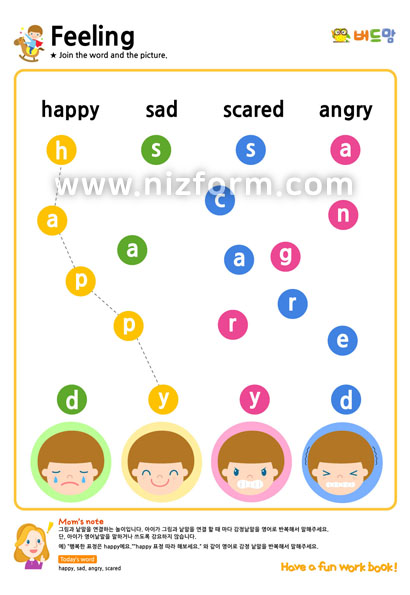 본 콘텐츠는 니즈폼(www.nizform.com)을 통해 서비스되는 영어창의놀이_감정놀이(연결하기)(으)로서, 프린트하여 사용하시면 됩니다.