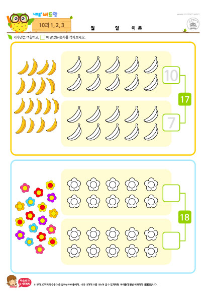 '10과 1,2,3'은 아이들이 이미 알고있는 1부터 10까지의 수로만 문제를 풀어보며, 자연스럽게 11부터 20까지의 수를 알아갈 수 있도록 학습을 구성 했습니다.