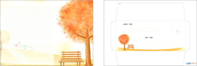 본 콘텐츠는 니즈폼(www.nizform.com)을 통해 서비스되는 가을편지지_편지봉투세트(나무와벤치)는 가정용 프린트기(A4)로 프린트하여 만들 수 있는 고급 편지지 세트입니다.