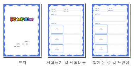 체험 동기, 체험 내용, 알게된 점, 느낀 점을 작성 할 수 있도록 구성되어 있으며 다운로드 되는 장수는 총 3장입니다.