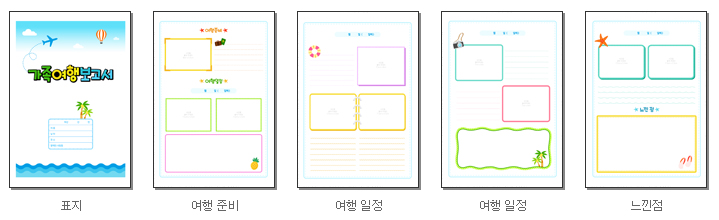 표지, 여행준비, 여행일정, 느낀점을 작성 할 수 있도록 구성되어 있으며, 프린트(A4)되는 장수는 총 5장입니다.