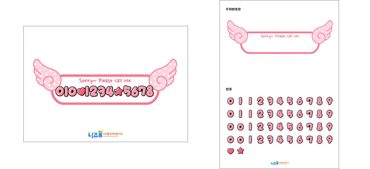 주차번호판과 직접 조합하실 수 있는 숫자들로 구성되어 있으며, 출력하셔서 주차번호판과 핸드폰 번호에 맞게 숫자를 자른 다음 주차번호판 위에 숫자를 붙여서 사용하시면 됩니다.