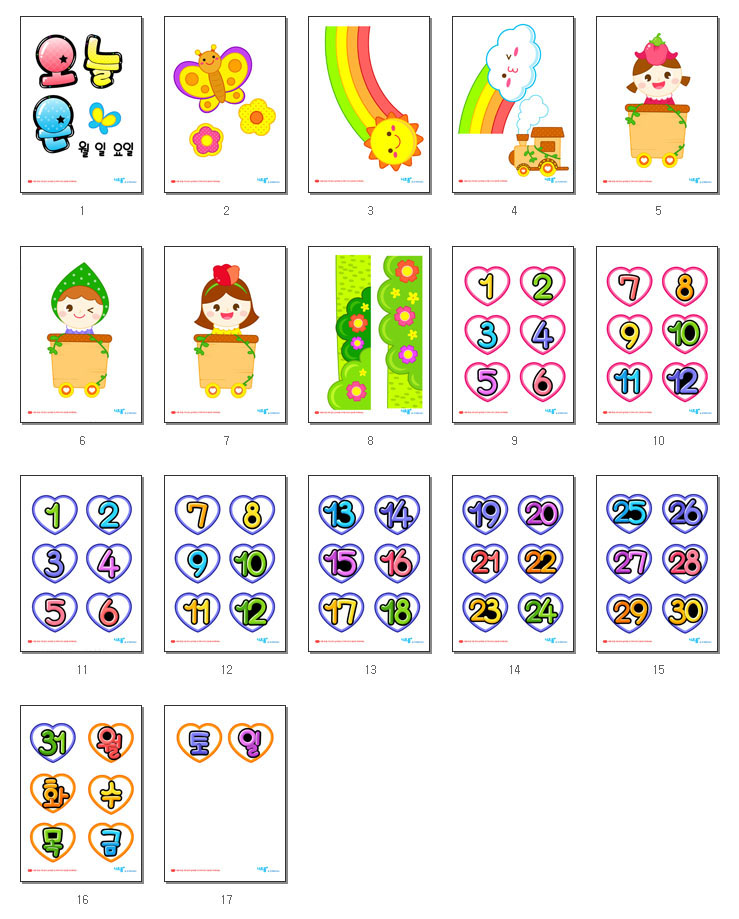 월,일,요일POP로 구성된 화사한 봄 느낌의 날짜판으로서, 프린트(A4)되는 장수는 총 17장입니다.