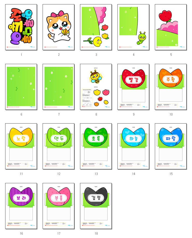 색종이판의 색상은 빨강, 주황, 노랑, 연두, 초록, 하늘, 파랑, 보라, 분홍, 검정 총 10가지로 구성되어있습니다.